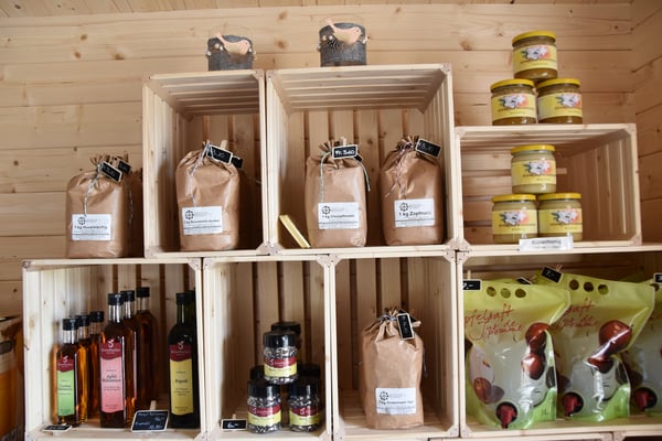 Rohmilch, Eier, Süssmost, Honig, Mehl, Schüblig, Käse, Joghurt, Äpfel, Sirup, Bauernhofglace,Kartoffeln und Karotten an.